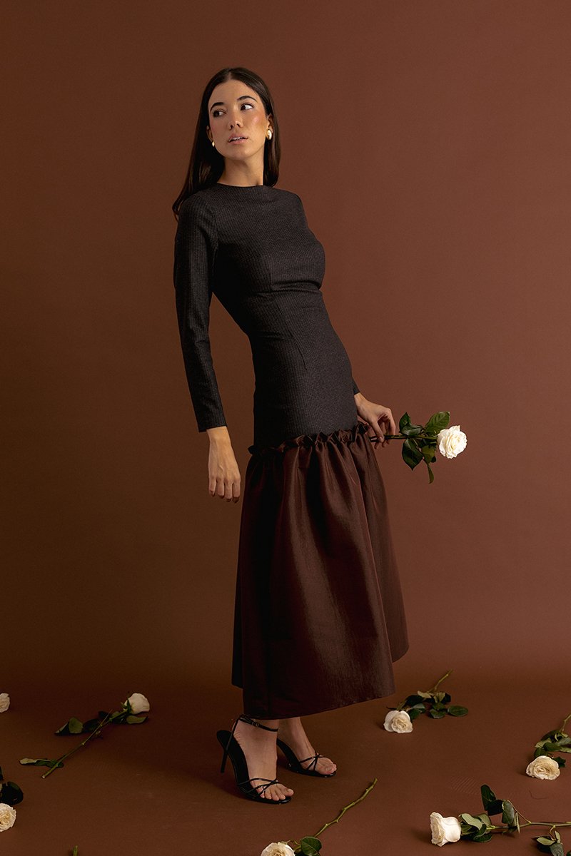 a partir de las cadera lleva flecos y debajo gasa