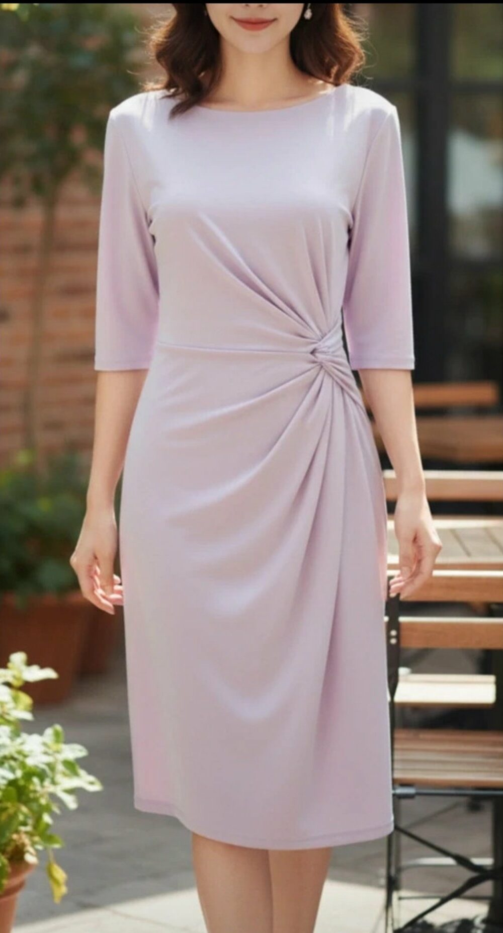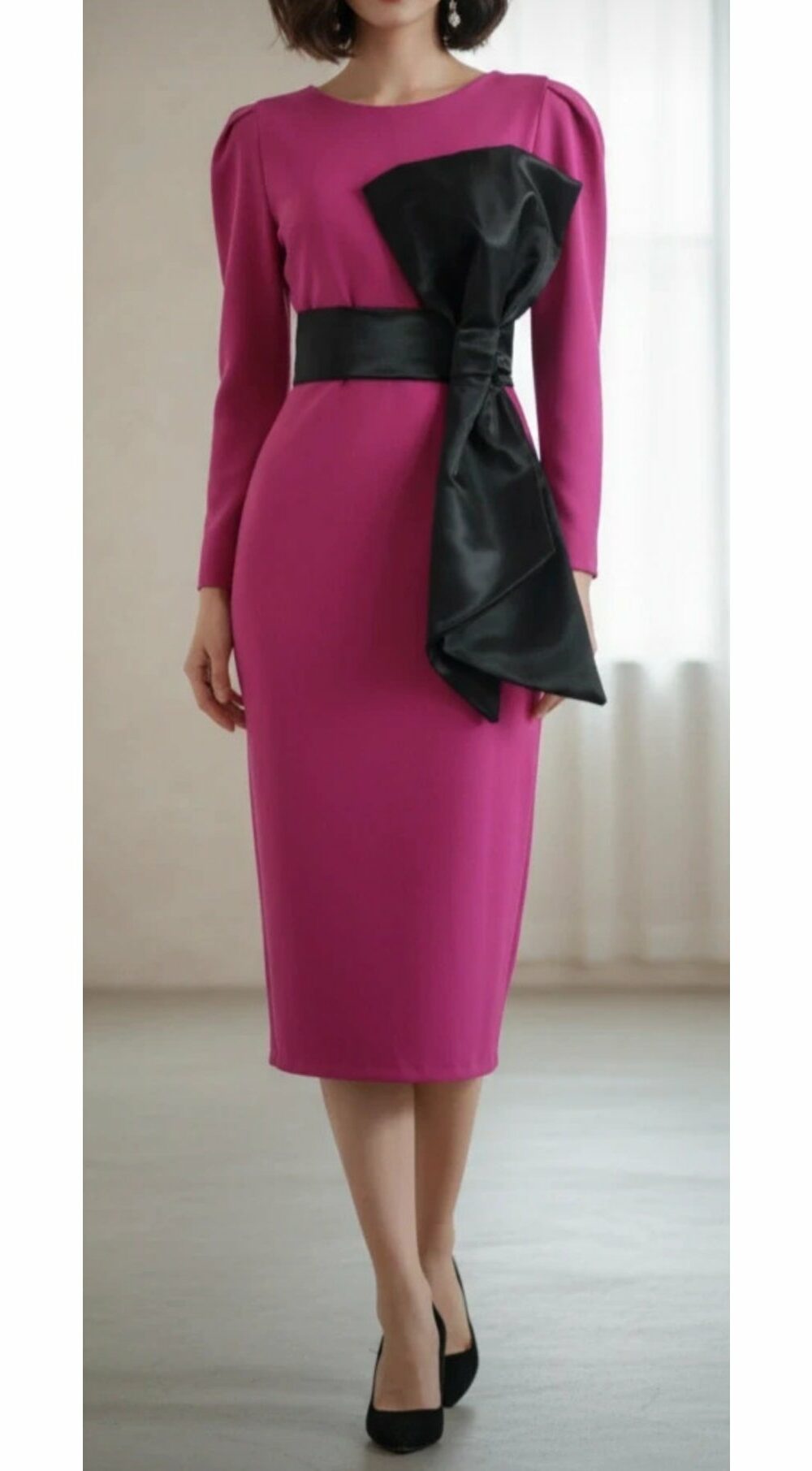 Vestido midi con escote barco y manga abullonada. Incluye cinturón con maxi lazada