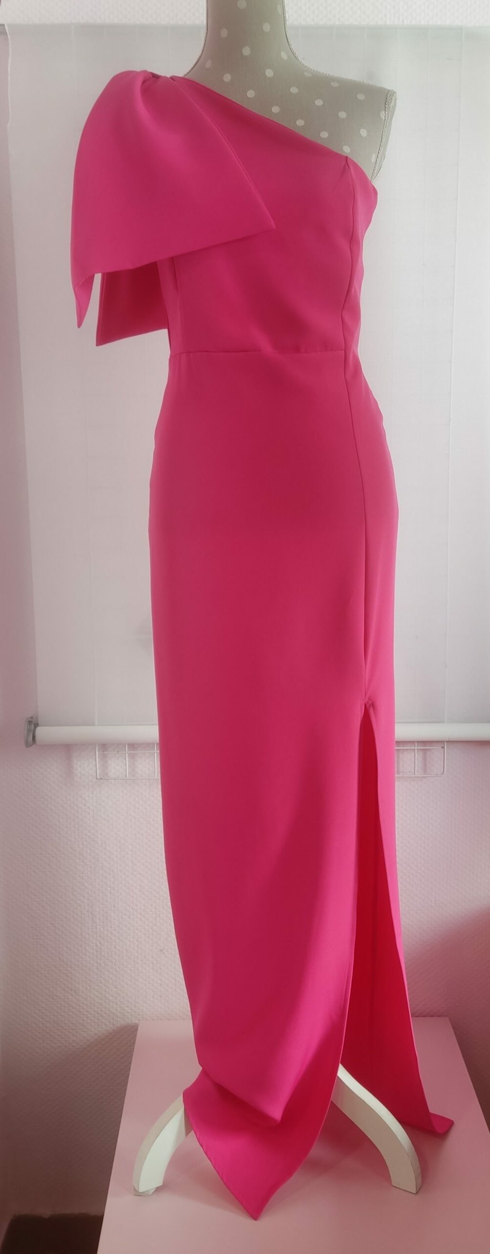Vestido largo entallado asimétrico de escote y gran raja lateral Moña zapatera en hombro