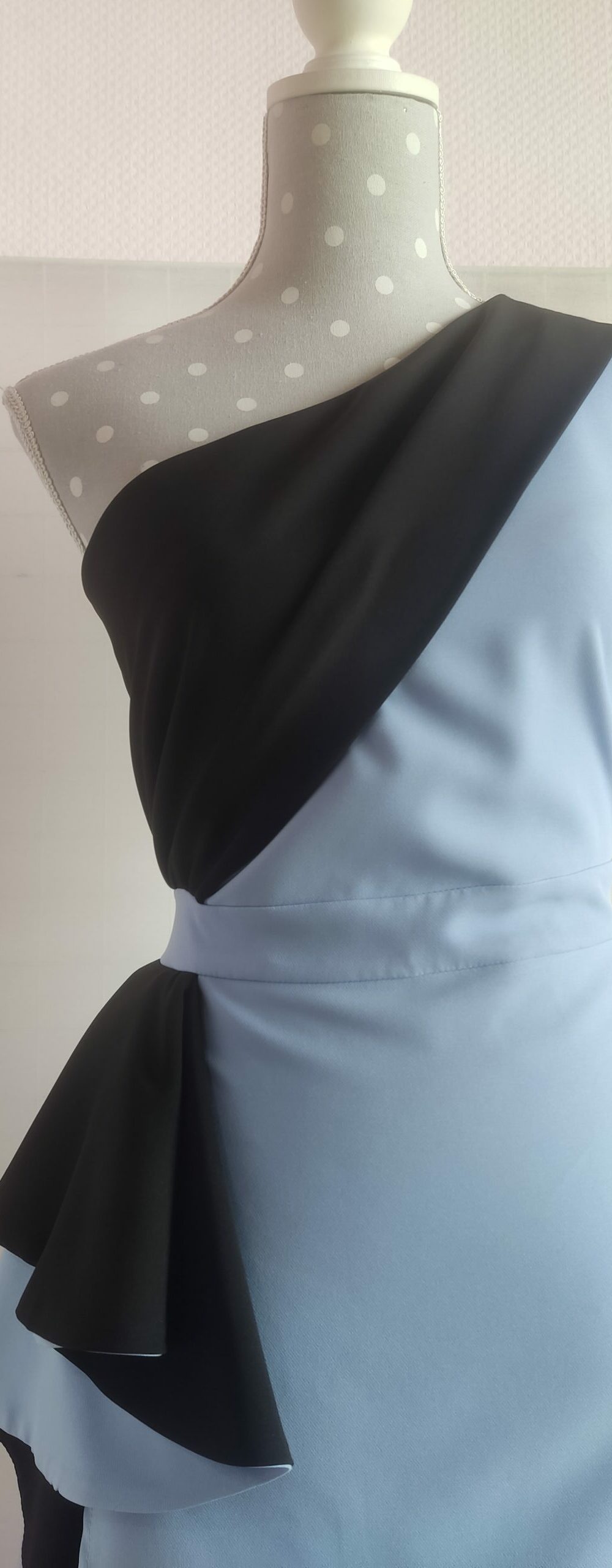 Vestido recogido hacia un lado. Tejido jacquard con lunar