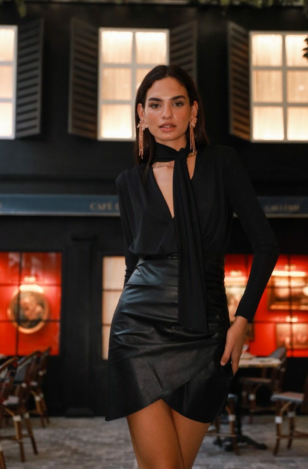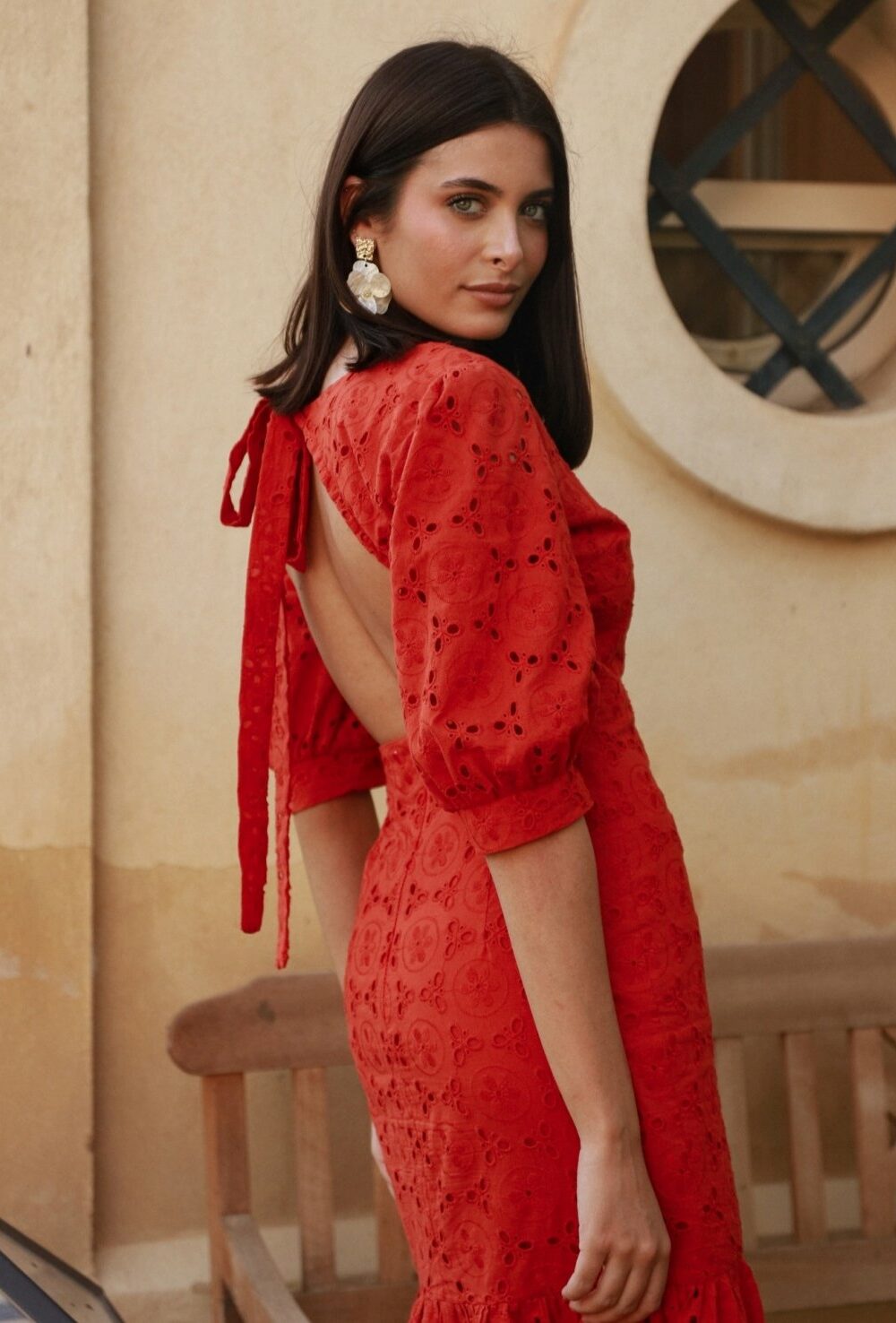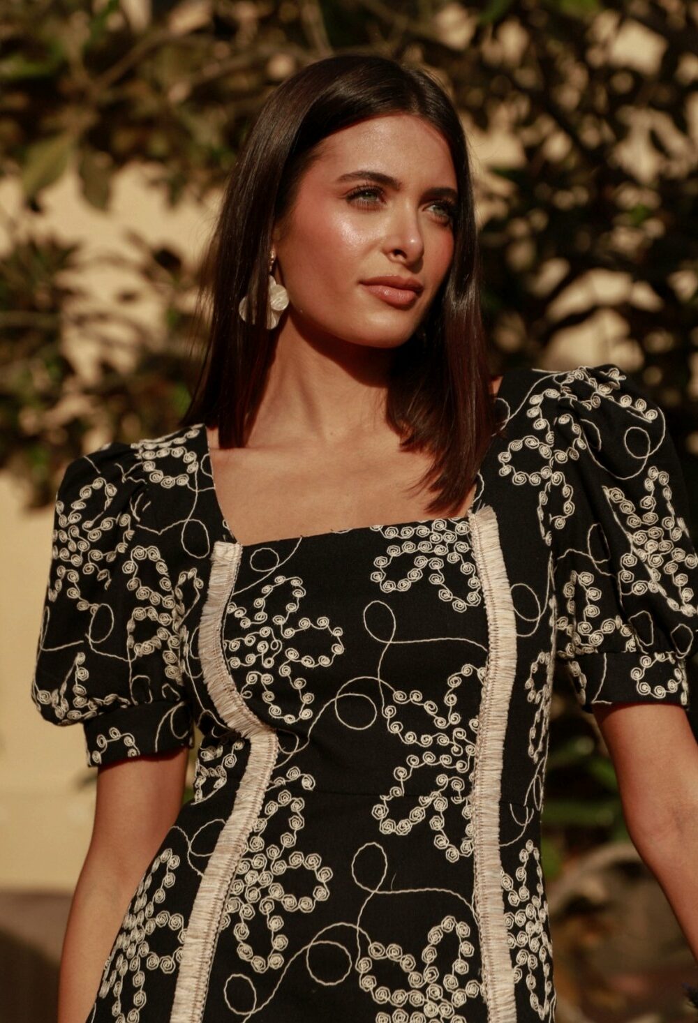 Conjunto, confeccionado en tejido de mezcla de lino, compuesto por top ribeteado en contraste, con manga murciélago y falda midi evasé con frunce delantero
