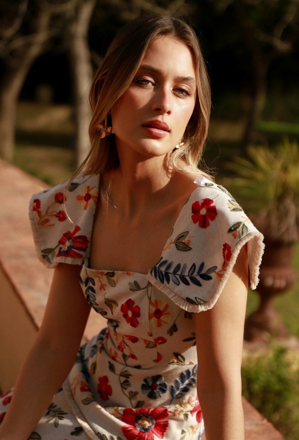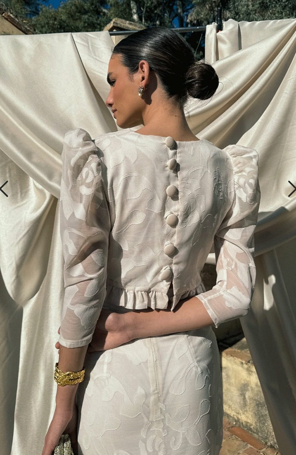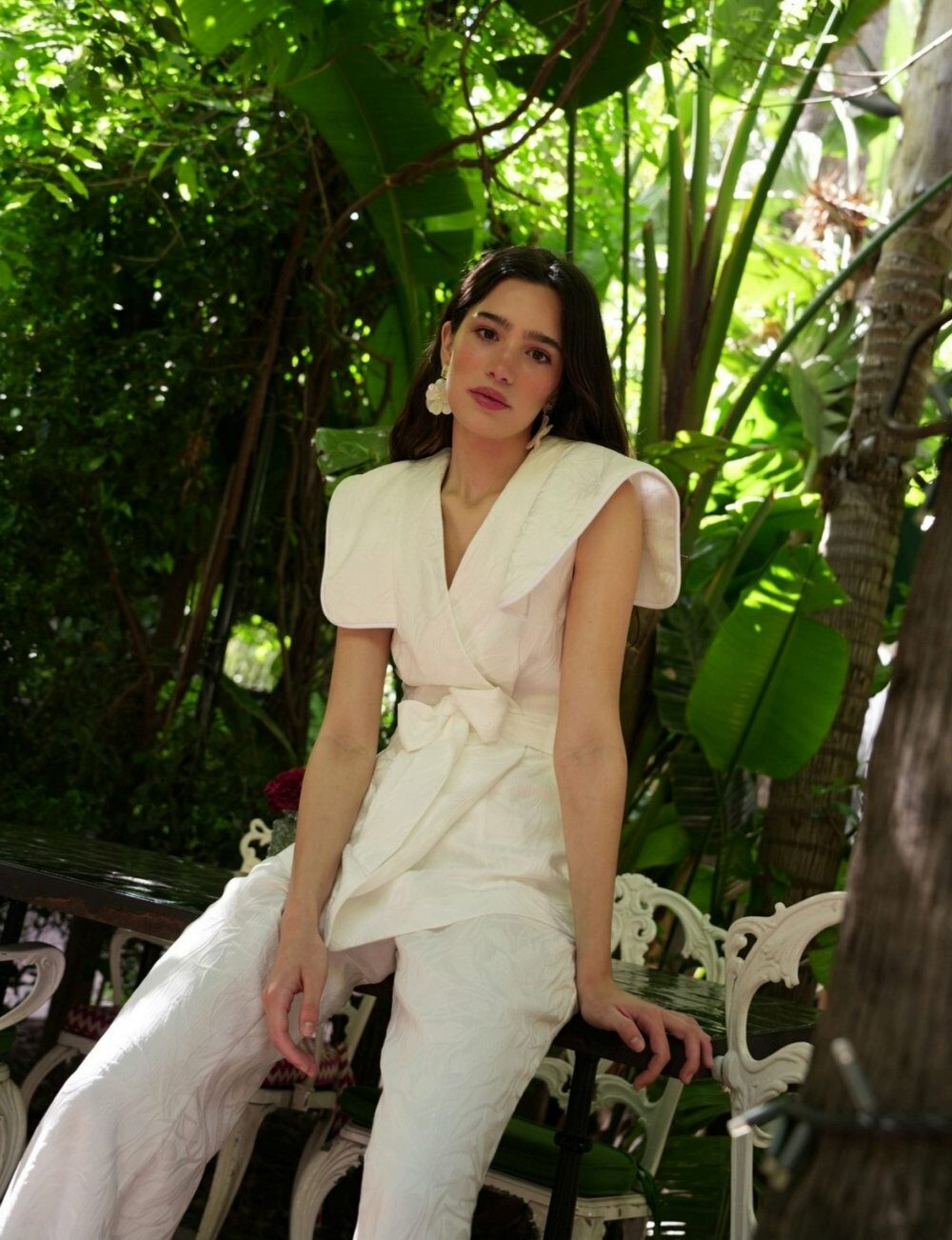 Conjunto compuesto por top de tirantes con escote corazón, frunce central y doble volante; y falda lápiz de largo midi con frunce central. Confeccionado en tejido de mezcla de lino
