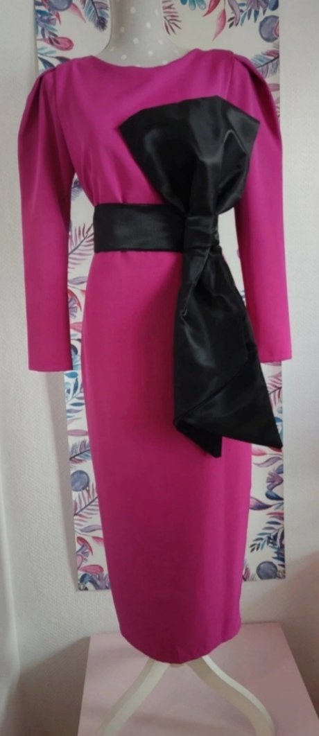 Vestido midi con escote barco y manga abullonada. Incluye cinturón con maxi lazada